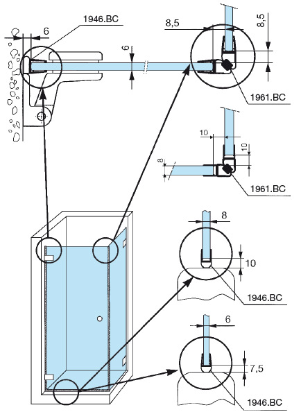 · Per a vidre de 6 a 8 mm. · Muntatge amb osca 3060E. · Material: Llautó. Eix inoxidable. · Pes màxim per fulla: 25 kg · Se subministra amb juntes. *** TOTS ELS PRODUCTES ASSA ABLOY BANY TENEN 7 ANYS DE GARANTIA ***