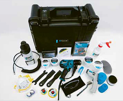 Kit complet per a l'eliminació d'esgarrapades en el vidre sense deformacions òptiques i per a altres imperfeccions, taques , grafitis i restes de soldadures. Tant en vidre monolític, laminat, temperat o corb.