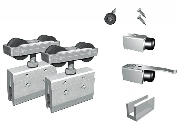 SV - A40 es un sistema para hojas correderas de 40 kg de peso. Tornillos separadores que posibilitan una regulaci n milim trica sobre el grueso de la hoja. Caras internas irregulares provistas de una materia antideslizante que ejercen gran adherencia cuando se presiona con los tornillos de apriete. Roldanas montadas con ruedas de nylon de gran resistencia y suavidad de deslizamiento, con regulaci n vertical. Freno retenedor. Pinza y guiador inferior regulables (8/10mm). No es necesario ning n mecanizado previo del vidrio.
