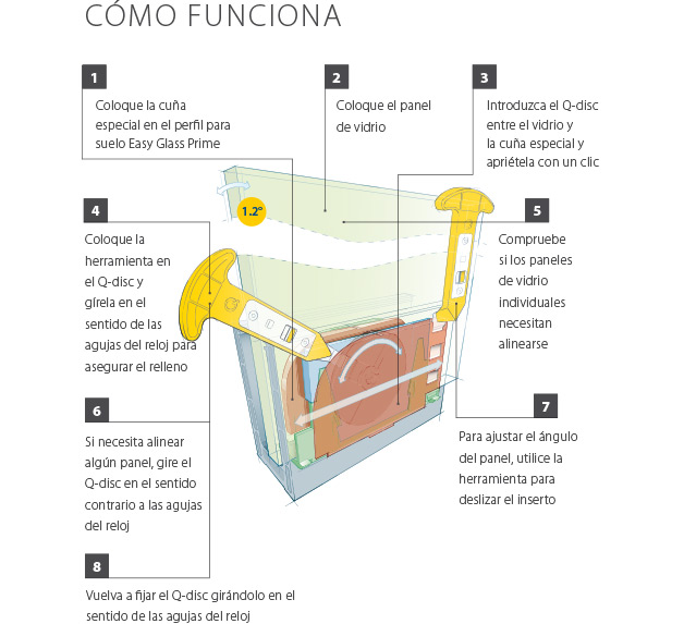 En la instalaci n de barandillas, el fabricante recomienda la instalaci n de vidrio laminado a partir de vidrio templado (VSG=2XESG) y pasamanos superior. EASY GLASS PRIME Para la alineaci n m s r pida de la historia. Ajuste del vidrio hasta 1,2 respecto a la vertical del vidrio. Ahorre tiempo en el montaje de barandillas de vidrio. *** VENTAJAS INMEDIATAS * UN DISE O DE PERFIL PARA SUELO MUY PR CTICO -Mucho espacio para manipular y colocar anclajes. -La gran durabilidad de los agujeros de anclaje hacen posible apretarlos sin esfuerzo. -Perfil para suelo de montaje superior sim trico. * FIJACI N OPTIMIZADA -Uso m nimo de materiales de fijaci n. -Una selecci n de m todos de fijaci n de perfiles para suelo. * ALINEACI N M S R PIDA DEL VIDRIO -Montaje y alineaci n del vidrio con el sistema ajustable Q-disc System. -Sistema intuitivo gracias a puntos de indicaci n y clics de confirmaci n. Todo se puede hacer desde el interior: con seguridad y sin andamios. * Capacidad: Uso intensivo. * Carga horizontal: Resiste hasta 3 kN/m. * Uso: Interiores y exteriores.
