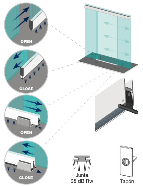 -APLICACI N: Puertas correderas de 12mm. -RECORTE: Hasta 150mm en lado opuesto al pulsador de empuje. -TIPO DE FIJACI N: Con cinta adhesiva de doble cara de alta resistencia. -TIPO DE PULSADOR Y REGULACI N: Palanca de accionamiento en el lado de la gu a de suelo. -JUNTAS: 4 labios de termopl stico co-extruido auto-extinguible. -CARACTER STICAS T CNICAS: Movimiento basculante friccionado (la bajada de la junta se produce primero en el lado de la gu a de suelo y despu s en el lado del tirador). Junta autom tica debajo de la puerta. Palanca accionada por la gu a de suelo. Desplazamiento 14mm. Resortes de acero zincado y bielas de empuje de PA 20% fibra de vidrio. Perfiles de aluminio de aleaci n 6060 T6. Tap n de acabado incluido. -CERTIFICACIONES: Ensayado para 200000 cierres.