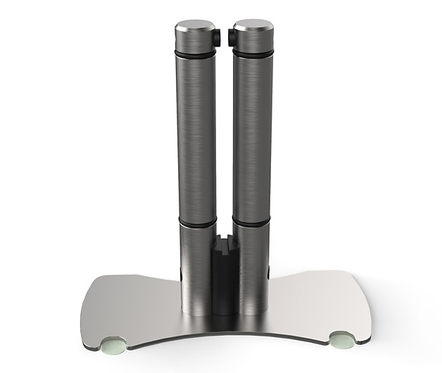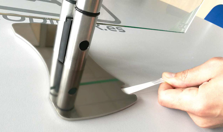 Las bases quedan fuertemente pegadas a la superficie mediante dos adhesivos (3M Command) creando una estructura r gida y resistente que impide que el vidrio pueda caer o moverse. 1-Tacos pl sticos para apoyo del vidrio. 2-Soporte vertical en acero inoxidable. 3-Taco de apoyo inferior. 4-Adhesivo 3M alta calidad para fijaci n a superficie con pesta a para retirar sin dejar residuos. 5-Perno de apriete para fijaci n del vidrio. 6-Base del conjunto en acero inoxidable.